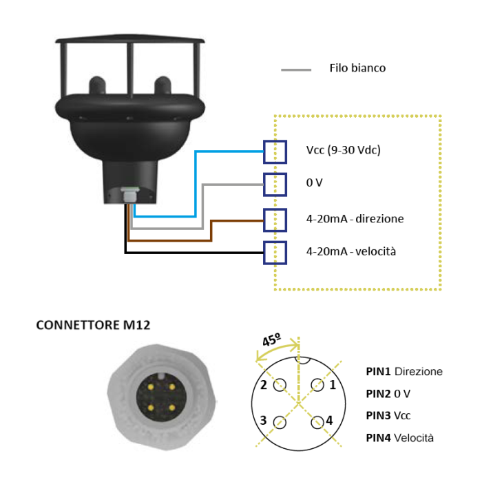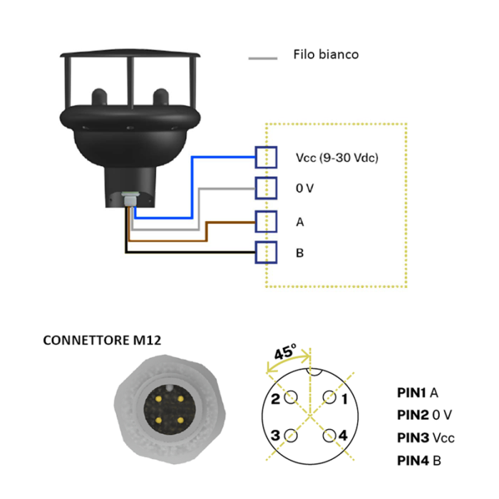 Un connettore M12 4 pin è collocato nella parte inferiore del dispositivo. L'unità è fornita con un cavo di lunghezza 5 o 10 metri a seconda della versione scelta.